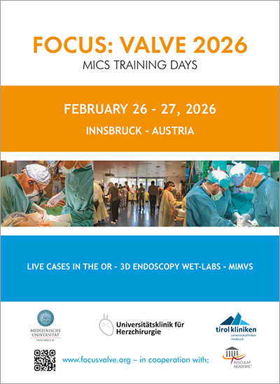 FOCUS Valve MICS Training Days is a skills-acquisition education program of the Focus Valve Platform and the Medical University of Innsbruck in cooperation with Aesculap Akademie based on the experience of more than 10 years Focus Valve minimally invasive valve surgery training courses.